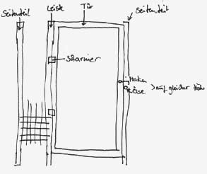 Rechts sieht man den Anbau des handelsüblichen Käfigs, der senkrecht zum selbstgebauten steht. Dort ist eine Zimmerecke und er passt tatsächlich unter eine Dachschräge, die sonst nicht genutzt würde.