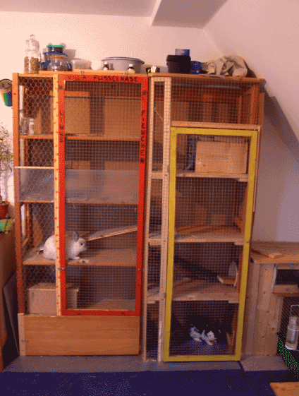 Nicht zuletzt sei gesagt: keine Angst vorm "selberbauen". Man braucht kein großes handwerkliches Geschick, um einen Kaninchenkäfig zu basteln, außer man erhebt einen großen ästhetischen Anspruch. Ich hatte diesen nicht, mein Ziel war eher einen sicheren Käfig zu bauen. Sowohl ausbruch- als auch verletzungssicher. Vorraussetzung für den Käfigbau ist zwar die Beherrschung einer Bohrmaschine und der Stichsäge (kann man ausleihen) - kurz an einem Probestück ausprobiert, kann aber auch der Laie für unsere Zwecke genügend damit hantieren.